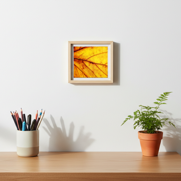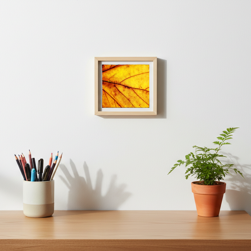 Golden Memory is a square-format fine art photographic print that emphasizes structure, light, and material quiet. Working through macro abstraction, the image reveals organic veining as an architectural system rather than a literal subject. Its restrained palette and luminous surface allow it to integrate seamlessly into residential, commercial, and hospitality interiors.